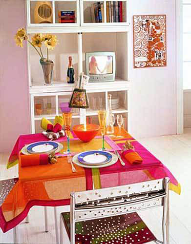 點綴:利用玻璃桌面反射的特點,改變周圍環(huán)境的色彩和紋理,就能間接地改變餐桌的個性。色澤柔和的餐布和餐具,立即使這款過于理性化的餐桌椅變得溫馨起來。