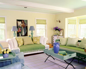 這也是用了一組亮度相同的相鄰色以條紋組合的形式出現(xiàn)在客廳的一面墻上,而這面墻相鄰的兩面墻分別刷成彩色條紋里的粉紅色和粉藍色。沙發(fā)和兩個坐凳的外套配備了和彩色條紋里相同的幾種顏色以隨時更換。