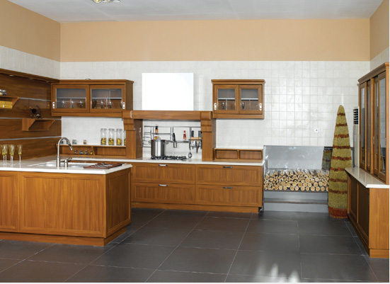 有橡木、櫻桃木、杉木等材質,其中橡木易上色,色彩更多。實木門板具有強烈的自然表達力。但國內實木櫥柜廠家工藝水平與國際尚有較大距離,而進口實木櫥柜價格昂貴,且外形變化較少,比較適合偏愛純木質地的中年消費者在高檔裝修中使用。由于其木材的本性,使用起來也比人造石等要相對細心。
