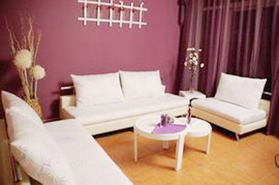 負責(zé)翻新的設(shè)計師說:“我開始設(shè)計時將客廳定位為溫馨、浪漫。因此,我用大面積的紫色和紫色的輕紗、麻紗營造浪漫、神秘的氣氛,為了不因為深紫造成抑郁的情緒,用了白色和粉色做點綴,使視覺有了對比關(guān)系?!?nbsp;為了達到功能和審美相結(jié)合,我和編導(dǎo)多次討論方案,如兒童區(qū)與會客區(qū)的隔斷用什么。開始我設(shè)計用繩子,從上而下作為虛隔斷,但實用性和美觀度都達不到。后來采用了鏤空的方凳,既可以放玩具,也可以作為凳子使用。