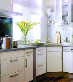 目前各樓盤的戶型,大多數(shù)的廚房面積都是3~4平方米,而我們的日用家電又越來越多,怎樣在有限的空間內(nèi)把這些家電和廚房用品都安置好?華潯品味裝飾設(shè)計(jì)總監(jiān)何志潮介紹,要把小面積的廚房變大可以考慮以下幾個(gè)方面:'借'空間;開發(fā)收納空間;把微波爐、冰箱等廚房用品放到餐廳處。