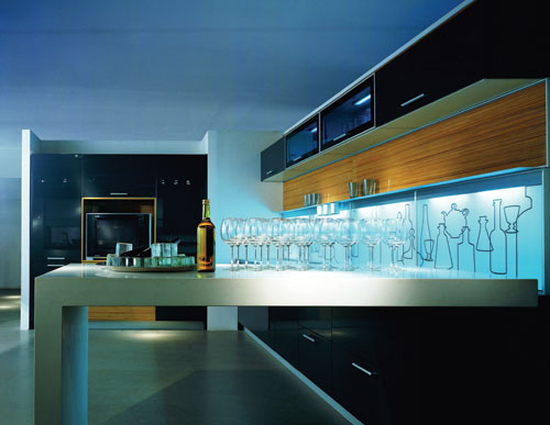冷峻的黑色櫥柜,工業(yè)設(shè)計(jì)感極強(qiáng)的白色吧臺(tái),現(xiàn)代化的視聽組合,暗藏彩燈的壁柜,甚至還有大做文章的墻壁,以不銹鋼擱板為界,上面是原始?xì)庀⒌哪?,下面是線條簡(jiǎn)潔的圖。如此分明的方式,組合著這些傳統(tǒng)和非傳統(tǒng)的事物,廚房陡然間變成各種新奇事物的展示臺(tái)。