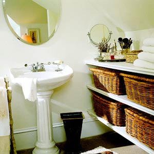 三層的置物架上整齊放置田園味十足的置物筐。置物筐可以方便的抽拉,用來(lái)分類存放毛巾及其他洗浴用品。