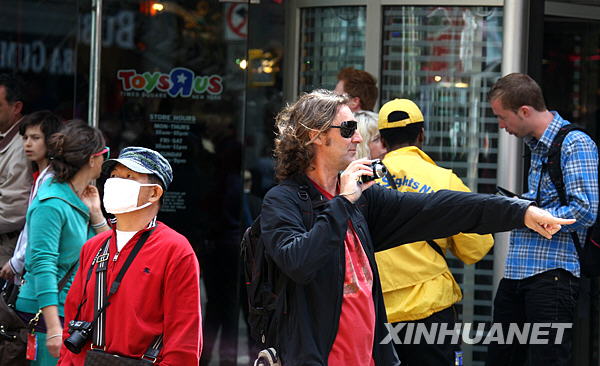 4月29日,在美國****廣場,一名日本游客戴著口罩,而另一名游客正在給同伴拍照。新華社記者劉欣攝