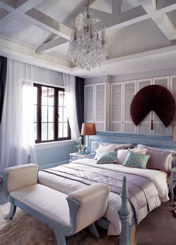 實用主義和浪漫主義可以在臥室中并存,藍(lán)白色調(diào)浪漫而沉靜,藍(lán)色清透與白色的安靜相互映襯,有著海一般的夢幻感覺,優(yōu)雅的配色似如歌的行板,浪漫溫馨,裝點出如水一般純凈又內(nèi)涵豐富的臥室氛圍。藍(lán)色的木質(zhì)床頭富于美感,被布藝包裹的床尾小幾,色調(diào)、風(fēng)格與床氣質(zhì)和諧統(tǒng)一,既有對比度又有連貫性,整面墻的白色衣柜有整潔而實用的收納功能。手感厚實富有光澤的床品搭配大小不同的靠包,圖案與色彩將臥室襯托得更空靈寧靜,白色的窗紗輕柔搖曳,透過柔和的光線,身體完全回歸到最原始自然的狀態(tài)。
