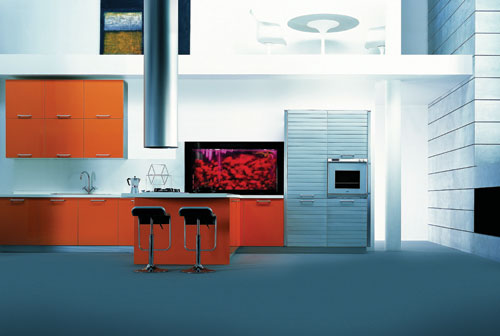 煙機(jī)不過(guò)是最常見(jiàn)的廚房道具,但在這里,復(fù)式的房子,為長(zhǎng)型的煙機(jī)提供了展現(xiàn)自我的場(chǎng)地,不僅能把功能發(fā)揮到極致,更能成為最引人注目的裝飾品。如果你有足夠的創(chuàng)意,不妨還可以像這樣把大型魚(yú)缸搬到廚房來(lái),讓他們營(yíng)造出更前衛(wèi)的效果。
