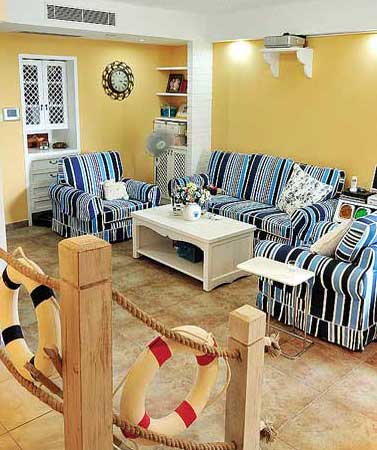一簾幽夢:自然浪漫的蔚藍(lán)色,把天空的寧靜與開闊帶到家中,通過明度上的提升,放大了居室的面積。蔚藍(lán)色與白色過渡十分流暢,正如白云和藍(lán)天的感覺,而暖色調(diào)的家具和布藝則為空間帶來朝氣蓬勃的感覺。