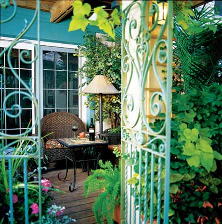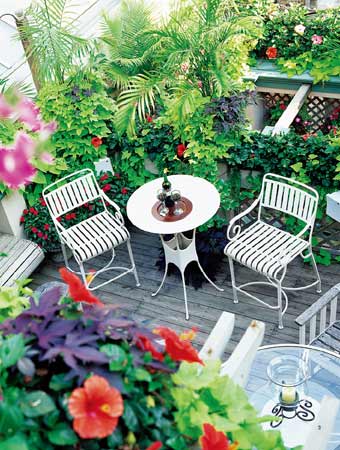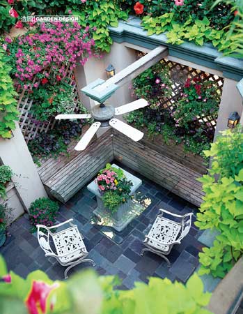 即使在沉悶的天氣里,下沉花園上方懸臂上的吊扇,也會(huì)給在花園里乘涼的人帶來(lái)習(xí)習(xí)清風(fēng)。到了寒冷的季節(jié),就是漂亮壁爐發(fā)揮作用的時(shí)候了,暖暖的火光能驅(qū)走寒冷,增加戶外空間的使用時(shí)間。花園中種滿熱帶氣息的植物,如棕櫚樹、芙蓉花、黑葉芋與一年生植物、蔓生植物填滿了花箱和花盆,給小庭院帶來(lái)生機(jī)勃勃的感覺(jué),也達(dá)到了阻隔外界視線、保護(hù)隱私的作用。而小噴泉潺潺的流水聲則把街道的喧囂淹沒(méi)在外。