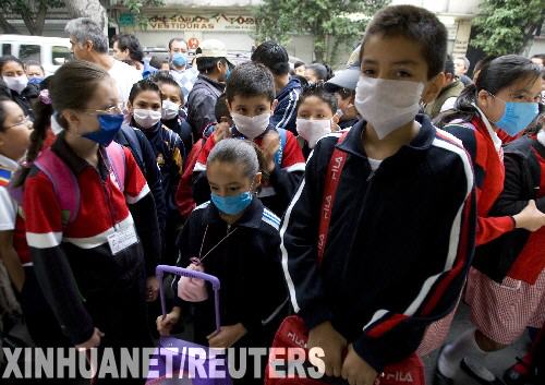 5月11日,在墨西哥首都墨西哥城,一些戴著口罩的小學生準備進入學校上課。當日,因受到甲型H1N1流感疫情影響停課的墨西哥中小學和學齡前教育機構開始復課。 新華社/路透