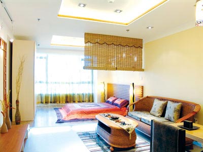 設(shè)計(jì)師心得:小戶型可考慮用一些不占用空間的手段,如燈光、顏色、材質(zhì)等區(qū)隔空間。韓式空間地臺(tái)下的燈光、楓木系列樣板間棚頂射燈的搭配等,都起到區(qū)隔空間作用。