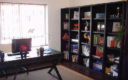 裝飾主義的書房需要很多空間來表現(xiàn),大面積的印花壁紙,大尺寸的織花地毯,空蕩蕩地閑置在一旁的花瓶和帷簾,這一切,都需要一組盡量少占用面積的書柜。內(nèi)嵌式的書柜節(jié)省了大量的占地面積,書籍封套紫紅、黑、紫紅的排列,產(chǎn)生強(qiáng)烈的裝飾效果。由于書柜與墻面形成了強(qiáng)烈的裝飾效果,書柜上的陳設(shè)反而可以簡化,裝滿書籍就夠了。