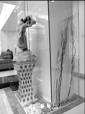客廳與休閑區(qū)之間的柱子被玻璃及灰鏡所虛化,以獨(dú)具氣韻的根雕和鵝卵石、干枝組成裝飾,成為客廳與休閑區(qū)的對(duì)景。