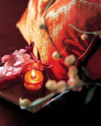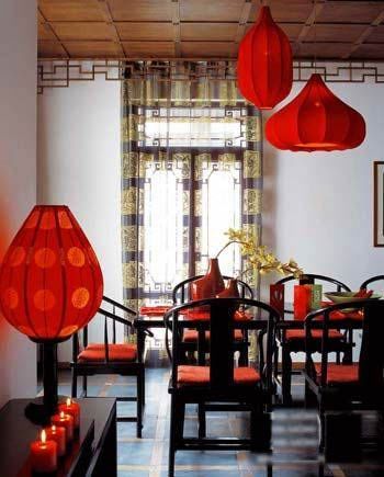 餐廳:食色雙馨 大多數(shù)居室中的餐廳都靠近客廳,所以在整體布置上,要考慮到與客廳的風(fēng)格相協(xié)調(diào),同樣物件的擺設(shè)不要過于繁雜。但餐廳的布置上可以多些濃烈的色彩,所以在婚慶氣氛中的餐廳,可大膽地多用些紅色,畢竟,鮮艷的顏色有增進食欲的效果。在具體布置上,可以適當(dāng)增加些瓷器的擺設(shè),不僅凸現(xiàn)了餐廳的就餐功能,同樣代表中國的瓷器的運用也呼應(yīng)了整個中式婚慶的家居風(fēng)格。中式餐廳中出現(xiàn)的織物不是很多,但紛繁的中式織物卻最能烘托婚慶的喜氣。所以,在餐桌上擺放各種鮮艷的中式刺繡的餐墊、杯墊,會起到畫龍點睛的效果。鮮花同樣也是布置中式婚慶餐廳的法寶,不可貪多,點到為止即可。餐桌燈的挑選不必拘泥傳統(tǒng),同一風(fēng)格不同造型的餐桌燈懸于桌上,反而倍添情趣?;ㄆ考跋灎T也不必拘泥于中式風(fēng)格,但同樣的大紅色彩融于整個中式婚慶氣氛餐廳內(nèi)不僅不顯突兀,反倒渾然一體。