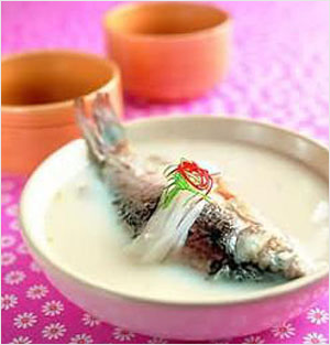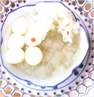 [做法]白鯽魚(yú)宰洗凈,慢火煎至微黃,濺入少許清水,鏟起;雞蛋煎為荷包蛋狀,鏟起;起油鑊爆香姜片,加入清水1250毫升(5碗量),武火滾沸,下白鯽魚(yú)滾片刻,下荷包蛋,滾沸后撒入適量食鹽、胡椒粉便可。