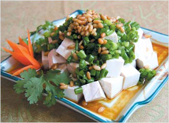 [配料]芹菜150克,豆腐1塊,食鹽、味精、香油個(gè)少許。