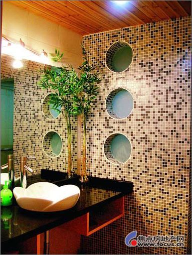 狂受80后年輕小資們追捧的復(fù)古馬賽克設(shè)計(jì),打亂拼搭出這個(gè)年代人獨(dú)有的個(gè)性品味!搭配上別致的花瓣形面盆,原木浴桶。簡約而不簡單!