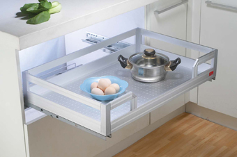 小型調(diào)料柜往往有不夠用的感覺(jué),足足有一扇門板大小的調(diào)料拉籃容量驚人,連砧板都能放進(jìn)去,置于爐臺(tái)側(cè)邊,成瓶的調(diào)料可以斜放,取用更方便快捷。