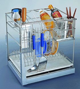 水槽下方的柜體空間很大,但空膛的利用率往往不高,因?yàn)橛泄艿?,不便于放擱板,要想有序地碼放東西,就要利用這種凹型抽屜拉籃,凹型口避讓了管道,寬大的抽屜讓取物更方便。
