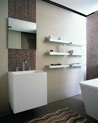 置身在博洛尼冰冷的太空艙稱得上是沁人心脾的清涼。金屬馬賽克鋪貼墻面和鈦鋁合金浴室家具的超強(qiáng)組合將清涼發(fā)揮淋漓盡致,光線的變換指揮著墻面有節(jié)奏的不停跳動(dòng)。沖個(gè)溫水澡,冰冷中彌漫溫情和享受。