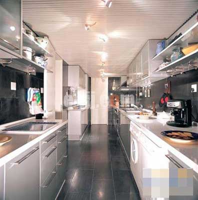 原本極為普通的水泥地面,因?yàn)榍渡狭擞昊ㄊ悴噬袡C(jī)玻璃塊,立即變得活靈活現(xiàn),讓人見(jiàn)之不禁想擺脫鞋襪的束縛,光著腳丫在上面重溫一下海邊嬉戲的快樂(lè)。重新筑建的取代整體櫥柜地位的水泥墻體也毫不遜色,開放式的格局設(shè)計(jì),冷熱光源的區(qū)分,讓存儲(chǔ)柜亦是展示柜,廚房小家電及器具既得到了安身立命之所,又成為狹小空間的裝飾點(diǎn)綴。與其它風(fēng)格相比,“一”字型和“L”型簡(jiǎn)約風(fēng)格的整體櫥柜更加適合這種封閉式的廚房空間。以直線條為主的整體櫥柜,因磨砂玻璃的加盟,有效地實(shí)現(xiàn)了期盼已久的瘦身,從視覺(jué)上為廚房減少了一些擁擠感,并為不甘寂寞的早餐桌騰出一席之地;絢麗的櫥柜飾面,不但可以激起人的食欲,在縱橫馳騁于白色瓷磚間的同色調(diào)的勾線和窗簾的配合下,徹底消除了沉悶的封閉氣氛。
