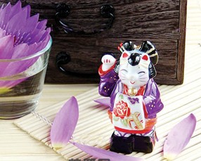 招財(cái)貓本來(lái)是白色的,生產(chǎn)者廣泛遍布于全國(guó)各地之后,才出現(xiàn)各種顏色的招財(cái)貓。一般說(shuō)來(lái),最具代表性的是三**,意味著走運(yùn)招福;黑貓,能避邪消災(zāi);黃貓,是祈禱能結(jié)得良緣;紅貓,則是無(wú)病息災(zāi)。