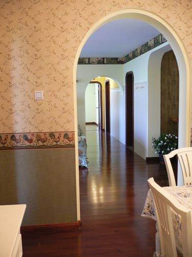 ②走廊護(hù)墻裙上貼的水移畫:其花朵圖案與頂上花朵形狀的吸頂燈交相呼應(yīng)表達(dá)了一種向往自然、田園的感覺。