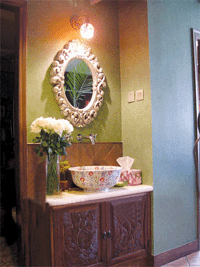 在這個獨立的洗手臺前,洛可可風(fēng)格的銅鏡上方用了一盞小小的花形燈作為鏡前燈,與小花圖案的洗手盆相呼應(yīng)。鏡子反射光線,以此來增強居室的空間感,很大程度上緩解了人對于狹小空間的恐懼感。并且,柔和的黃色燈光與深綠色的壁紙、深咖啡色的衛(wèi)浴柜搭配在一起,整個色調(diào)顯得豐富而不突兀,很有藝術(shù)裝飾性。
