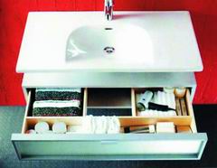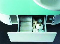 如果限于條件,沒有在墻上安裝配件,也沒有展示架,那就要在浴室柜上大做文章。根據(jù)衛(wèi)生間的面積大小及結(jié)構(gòu)特點,選擇大小合適、設(shè)計合理的封閉型浴室柜,將各種洗漱用品、化妝品藏在里面,給人以整潔清爽的印象。另外,一些備用的衣服、毛巾、紙巾,還有潔廁劑等清潔用品,也可以分類放入其中。