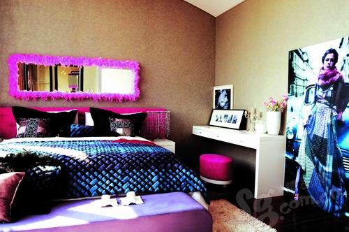 3.主臥室低調(diào)奢華的感覺主要靠軟裝來體現(xiàn),比如波希米亞風(fēng)格的床品、波斯風(fēng)格的靠墊、背景墻上粉色羽毛及水鉆床頭燈。這個(gè)房間有濃濃的英倫范兒,其實(shí)就是墻上的一幅背景畫創(chuàng)造成。這糅合了唯美、叛逆、優(yōu)雅、浪漫、迷醉的氣質(zhì),會(huì)讓每個(gè)人心動(dòng)。