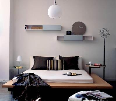 利落的線條充滿整個(gè)房間,原木色的寬邊床可移動(dòng)的小幾設(shè)計(jì)周到,背景墻上錯(cuò)落安置的CD架,利用材料的多元變化和幾何造型的有機(jī)融入,讓視覺呈現(xiàn)出舒緩的起伏,金屬衣架豎立要床旁,既實(shí)用又強(qiáng)調(diào)了空間的設(shè)計(jì)感。