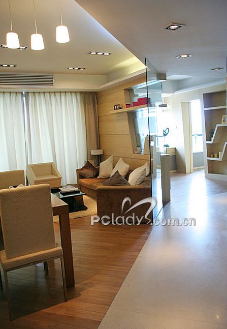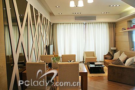 編輯點(diǎn)評:由于這個戶型的整體形狀不規(guī)則,設(shè)計師為了很好地利用空間,使布局更適合用家,將格局進(jìn)行了調(diào)整。以通道貫穿了各個不同空間,同時起到了劃分空間的作用。經(jīng)過調(diào)整,客廳與敞開式的書房構(gòu)成三角形,客廳雖然面積不大,但光線非常充足,還需要用大大的簾子來稍作阻隔。設(shè)計師在這個空間里,充分利用不同材質(zhì)作間隔,劃分空間,又利用很多玻璃、鏡面拓寬空間。間隔客廳和書房的墻體,被巧妙地做成裝飾隔板,上面可以放些主人家喜歡的家居精品,烘托二人的精致世界??蛷d里采用的大多是色調(diào)較淺且線條簡約的家具,打消了空間的沉悶與局限。