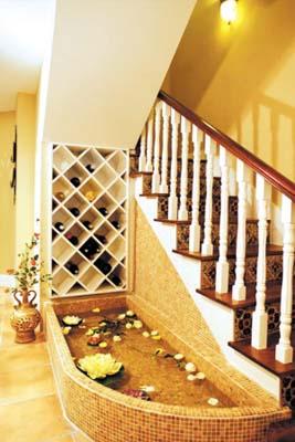 敲開門的瞬間,我們誤以為時空交錯,闖進了哪位歐洲貴族家庭。厚重的實木手工沙發(fā)有著絲絨的質(zhì)感以及流暢的歐式卷草紋,精美的仿真電壁爐與一幅古樸的油畫相呼應(yīng),木制畫框上仿佛還積著一些塵埃和斑駁的金漆。一樓被劃分為會客區(qū)、視聽區(qū)和餐廳,客廳餐廳之間過渡了一池美麗的睡蓮。