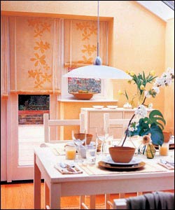 墻面粘貼了大面積的淡黃色壁紙,房間有了色彩。但僅僅如此是不夠的,如果在門窗上加上十分搭配的布簾,效果會(huì)更好。這里用印有簡(jiǎn)單花朵的淡黃色壁布做成簡(jiǎn)練的幾道卷簾。雖然餐廳里的家具都很簡(jiǎn)單,但挑選風(fēng)格諧調(diào)的壁紙、壁布相互搭配,餐廳開始變得有情致。