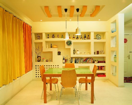 在窗簾與吊頂上運(yùn)用了橙色。在餐廳中使用這種顏色是為了增加人的食欲。