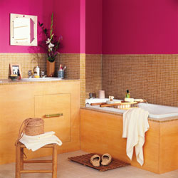 這個衛(wèi)浴間有著現(xiàn)代和傳統(tǒng)兩種元素的痕跡,浴缸和面盆都是十分普通的,所用的馬賽克和地磚種類也都是物美價廉的裝修材料。但它們卻用了大膽的相互結合的手法,墻的上半部采用十分強烈的紅顏色,浴缸和面盆都用木貼面裝飾,并以馬賽克做鑲邊,飾品和輔助的家具運用傳統(tǒng)的樣式和材料,一間特殊味道的衛(wèi)浴間就形成了。