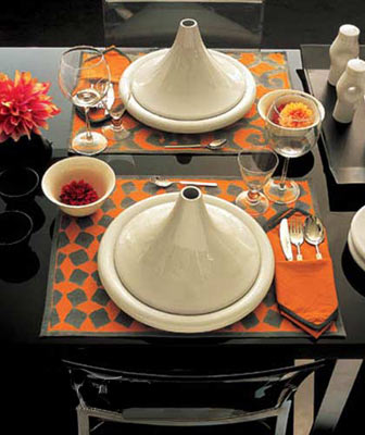 節(jié)日里,當(dāng)然要把黑色的單調(diào)感降到最底!波普藝術(shù)的“小火山”造型的白色套盤擺在黑色桌面上非常顯眼。節(jié)日餐桌的布置不僅如此,還需要增添一些溫暖的元素,鋪上橙灰相間、圖案有別、帶民族感的餐墊,既能與波普風(fēng)格套盤很好的搭配在一起,又能帶來(lái)非常豐富的視覺(jué)效果。為了讓這種“暖”和“諧調(diào)”完美到底,餐巾一定要與餐墊保持同一色系,還可以適當(dāng)?shù)卦谛〔璞托』ㄆ坷锓派匣ǘ洌瑸轱L(fēng)格跳躍的餐桌增添柔和的點(diǎn)綴。
