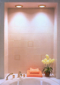 第一部分包括淋浴空間和浴盆、座廁等空間。是以柔和的光線為主。照度要求不高,要求光線均勻。光源本身還要有防水功能、散熱功能和不易積水的結(jié)構(gòu)。一般光源設(shè)計(jì)在天花和墻壁。其實(shí)很多情況下浴室吸頂?shù)娘L(fēng)機(jī)中的光線較暗,比理想照度要差,浴霸由于是強(qiáng)光發(fā)熱光線太強(qiáng)都不適合浴室照明。應(yīng)當(dāng)有專門的照明光源來解決問題。一般在5平方的空間里要用相當(dāng)于60W當(dāng)量的光源進(jìn)行照明。而對(duì)光線的顯色指數(shù)要求不高,白熾燈、熒光燈、氣體燈都可以。相對(duì)來講我比較主張墻面光,這樣可以減少頂光源帶來的陰影效應(yīng)。光源最好離凈身處近些,只要水源碰不到就可以。