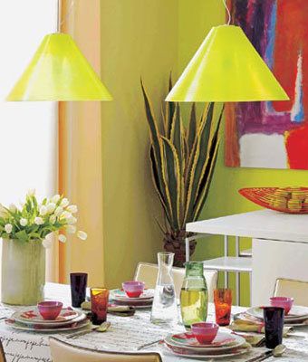 餐桌上綠色的吊燈與綠色的墻壁相呼應(yīng),不會(huì)讓白色餐廳在整個(gè)房間中顯得突兀。餐桌上一塊英文手寫體圖案的桌布避免了白色餐桌的單調(diào),餐具上繽紛的顏色將房間的整體風(fēng)格縮小到杯盤之間,成為餐桌上的點(diǎn)睛之筆。白色花瓶里的白色鮮花讓用餐氣氛更溫馨。