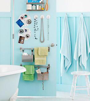 毛巾、手紙、電吹風(fēng)……統(tǒng)統(tǒng)請上墻去。幾塊簡單的玻璃板懸于壁上,用來擺放化妝品。