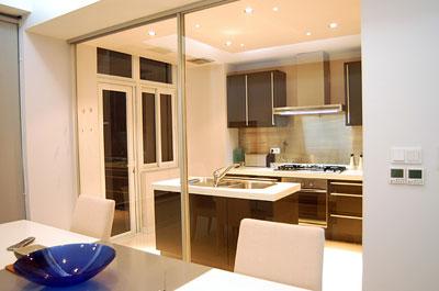 建議一:空間改造要巧 每個廚房空間在建筑時均會有防火墻或過頂梁等基本結(jié)構(gòu),對廚房隔墻改造時,一定要考慮結(jié)構(gòu)的現(xiàn)有情況,做到“因勢利導,巧妙利用”。如要改造的墻體上有過梁,可以保留此過梁,將它改造成“開放式廚房”的吧臺燈光頂,而不能將它拆除,以免影響到建筑結(jié)構(gòu)的穩(wěn)定性。