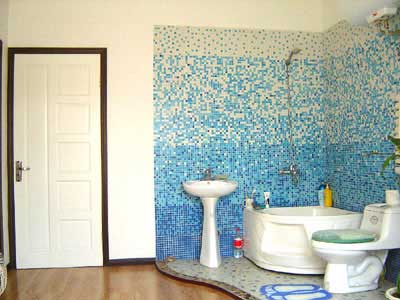 男性更多是傾向一些物質(zhì)和實用的,女性是傾向一些精神和表演的,無論流蘇也好,懸掛的飾物也好,更多是在表演。個性的確立于張揚在自我空間得以最徹底地演繹,這種個性的可能性在衛(wèi)浴間給予了女性廣泛的心理空間,讓空間生活因歸還本位而回到了最原始孩童時代,這一回歸帶來了精神上的逾越,讓空間自我得隨意、可愛、沉醉。暖色的玻璃馬賽克搭配淺灰色墻磚,強烈的色塊對比,讓整個衛(wèi)生間布滿后現(xiàn)代藝術(shù)氣息。