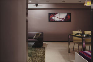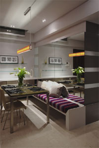 設(shè)計師為公寓客廳選擇線條簡潔的紫褐色沙發(fā),透明的玻璃茶幾。飯廳里特別定做的長凳子,配搭上艷麗的紫紅色坐墊,叫飯廳亮麗起來。