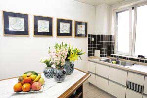 在一個(gè)面積并不是太大的廚房里設(shè)置一個(gè)“大塊頭”吧臺,還是不規(guī)則的形狀,目的何在?原來奧秘就在于業(yè)主的需要。由于居住者是一個(gè)外國人,愛好結(jié)交朋友的他喜歡邀請朋友來家里吃飯和聚會。在外國人的觀念里,給朋友做飯是件幸福的事情,于是在廚房里根據(jù)廚房的形狀定制了一個(gè)吧臺,自己做飯時(shí),朋友能夠坐在這里來杯咖啡,并和自己聊天。