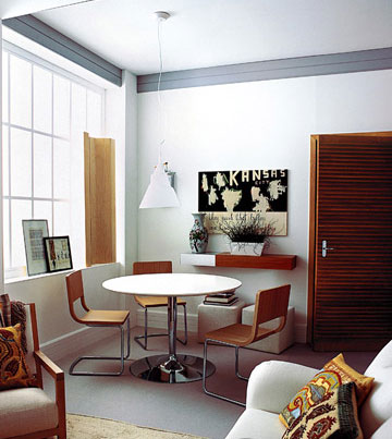 白色、灰色、原色的搭配似乎是一種小空間最為安全卻顯保守的解決方案,然而戈文的家卻并不因此顯得乏味和枯燥。他從古董店精心挑選的幾件東方彩繪陶瓷瓶被分別安排在了餐廳、客廳和臥室的角落;幾只古典圖案的刺繡靠墊隨意擺放在沙發(fā)和扶手椅上。另外,熱愛藝術(shù)的他也忘不了到巴黎的藝術(shù)區(qū)去淘購幾張原創(chuàng)的裝飾畫和海報,分別用來裝飾幾個大空間的白色墻面和窗臺。另外,盆栽植物也是必不可少的裝飾品,餐廳和臥室的幾盆綠色植物為戈文的公寓增添了一絲生機,填補沒有花園的缺憾?!耙郧昂透改缸≡谝黄?,我常常幫助他們打理花園,現(xiàn)在雖然還沒能擁有自己的花園,但我一樣細心照料這幾盆小生命。比起晚間的電視節(jié)目,它們更能讓我體會到家的氣息,我會與它們一起共同生活和成長。”戈文這樣解釋。