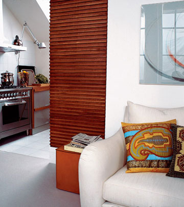 與單純色調(diào)形成對比的是大量木質(zhì)家具、凹凸的門板和隔斷。尤其在廚房的建造上這一特點更為突出,櫥柜和操作臺同為天然木質(zhì),加上規(guī)律的橫向條狀凹凸,為這個不足5平米的小空間加強了縱深感。同時,專業(yè)的金屬灶具合理地鑲嵌在櫥柜中,實用且方便,讓戈文一有機會就可以向三五好友展示他的烹飪技術(shù)?!半m然在家烹飪的機會不多,但我喜歡周末時與朋友分享一只烤雞或煎羊排,那是任何餐館都烹飪不出的一種味道?!备晡淖院赖卣f。