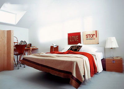 臥室的布置是舒適柔和的,大件的家具都采用了溫和的質(zhì)地和色彩,而床頭上方的艷麗海報又成為了增添情趣的點睛之筆。