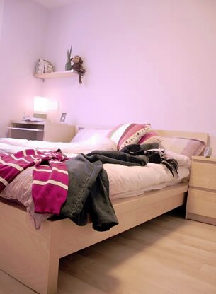 整個(gè)臥室,所有的家具,都是從宜家搬來。甚至連臺(tái)燈、鬧鐘、相框也是一樣。床背后那大塊空白的墻,留著以后掛上自己拍攝的最得意的照片。簡單的線條,簡單的擺設(shè),摒棄的是過分的浮夸和瑣碎。生活就是應(yīng)該充滿享受。