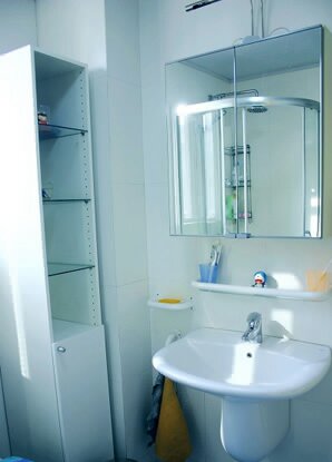 一直設(shè)想著,把洗手間打扮的海一樣的藍(lán)。四方的盥洗室,五個(gè)平方都沒的空間里,只有藍(lán)和白。藍(lán)的清新,白的干凈。形成鮮明的對(duì)比,就這么簡單。
