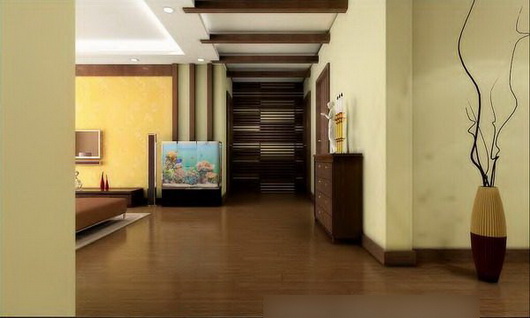 客廳的處理采用了大氣的回廊型吊頂,電視墻采用中式古典的立柱,以及具有中國(guó)傳統(tǒng)文化氣息的“印章”(壁紙)處理方式,再加上中式吊頂和胡桃木色的地板,簡(jiǎn)約中略帶中國(guó)風(fēng);整個(gè)客廳的亮點(diǎn)是立柱下的魚缸,它擺放的位置正好是整個(gè)居室的“財(cái)位”,不僅在風(fēng)水設(shè)計(jì)中體現(xiàn)中式元素,也給空間增添了生氣。