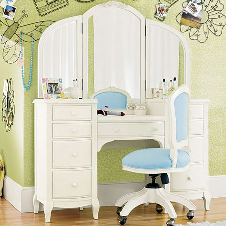 大多數(shù)化妝臺都配有一塊鏡子,一般設計在桌面以上的位置。但是,也有單配的掛在墻上。如果是這樣,安鏡子的時候就要注意鏡子怎樣安才方便化妝,比如弄成可推拉、可折疊的。如果臺面下有些小抽屜,存放珠寶首飾之類的東西拿出放進就會很方便。